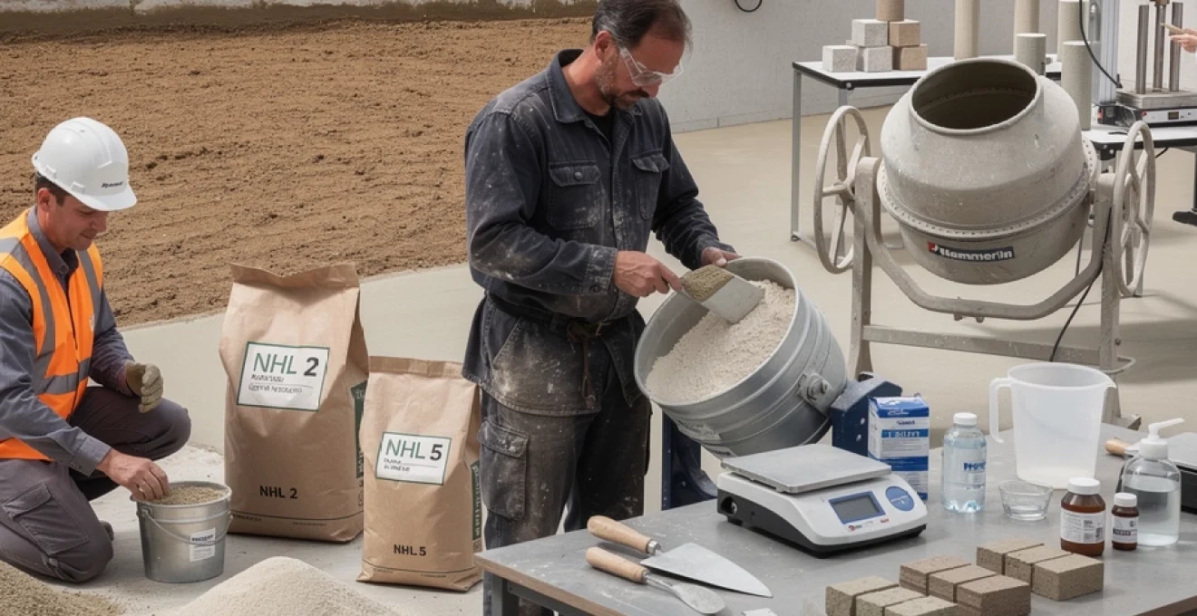 Le choix entre la chaux hydraulique NHL 2 et la chaux hydraulique NHL 5 conditionne directement les proportions du mélange. La NHL 2, avec sa résistance de 2 à 5 MPa, nécessite un dosage de 1 volume de chaux pour 2,5 à 3 volumes de sable pour les applications courantes. La NHL 5, plus résistante avec 5 à 15 MPa, permet un dosage plus économique de 1 volume de chaux pour 3 à 4 volumes de sable, selon les sollicitations mécaniques attendues.